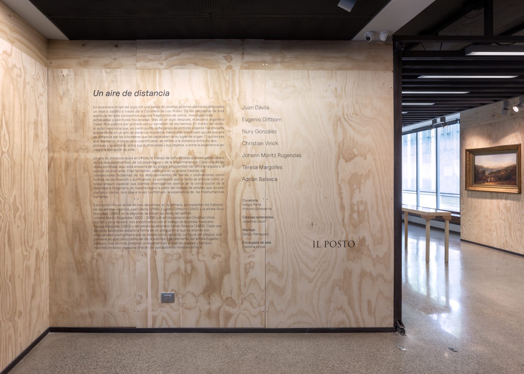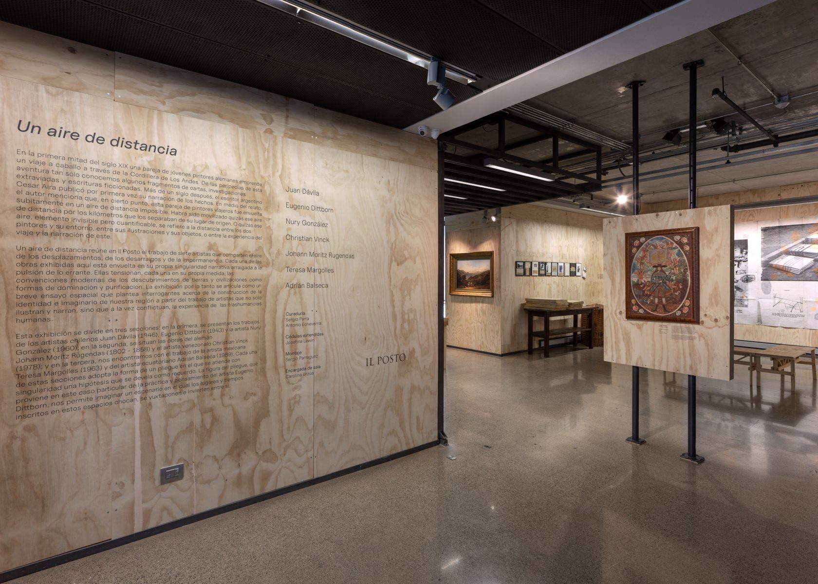 Un aire de distancia reúne en Il Posto el trabajo de siete artistas que comparten el aire de los desplazamientos, de los desarraigos y de la impermanencia. Cada una de las obras exhibidas aquí está envuelta en su propia singularidad narrativa arraigada a la pulsión de lo errante. Ellas tensionan, cada una en su propia medida, las convenciones modernas de los descubrimientos de tierras y civilizaciones como formas de dominación y purificación. La exhibición por lo tanto se articula como un breve ensayo espacial que plantea interrogantes acerca de la construcción de la identidad e imaginario de nuestra región a partir del trabajo de artistas que no sólo ilustran y narran, sino que a la vez conflictúan, la experiencia de  las trashumancias humanas.