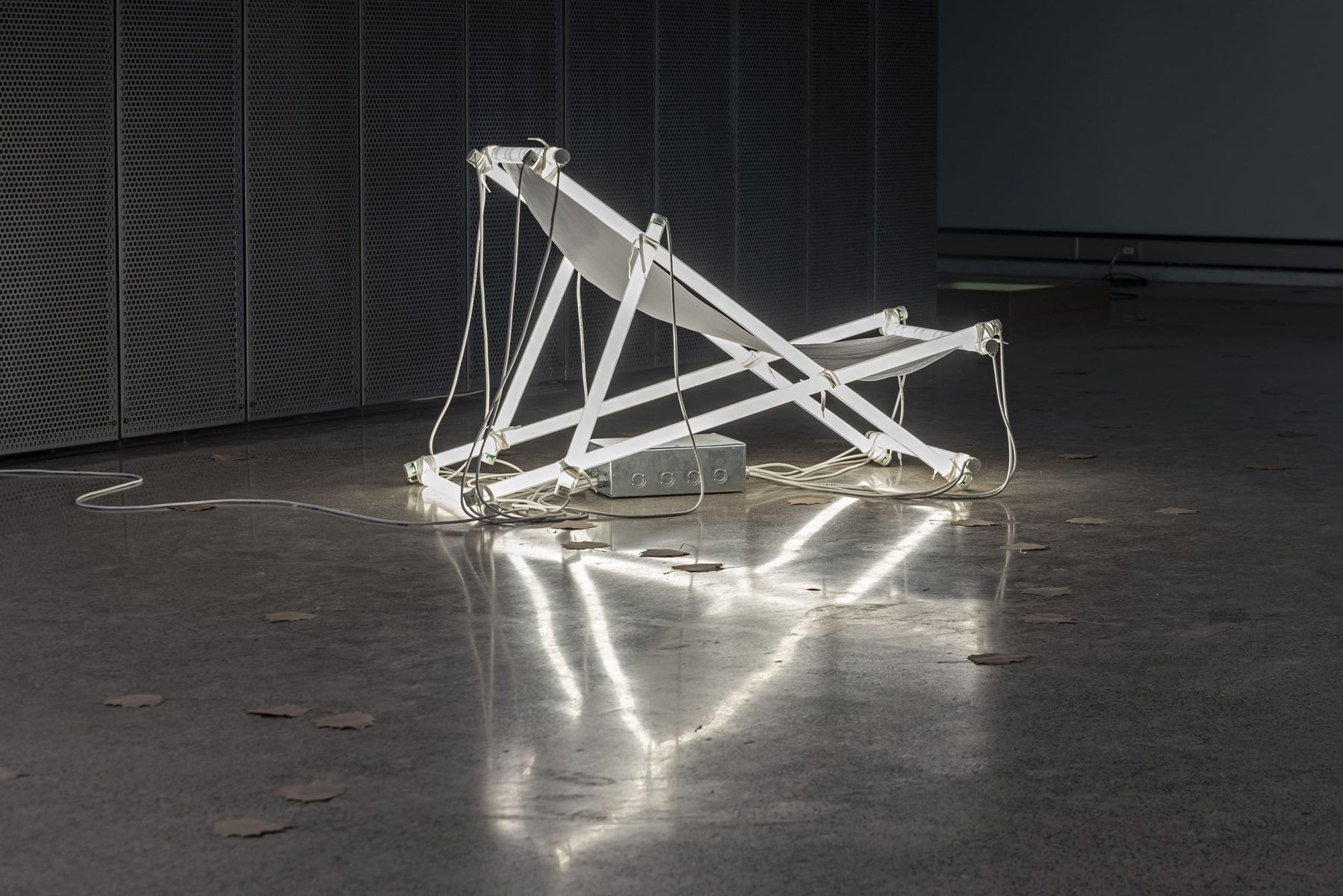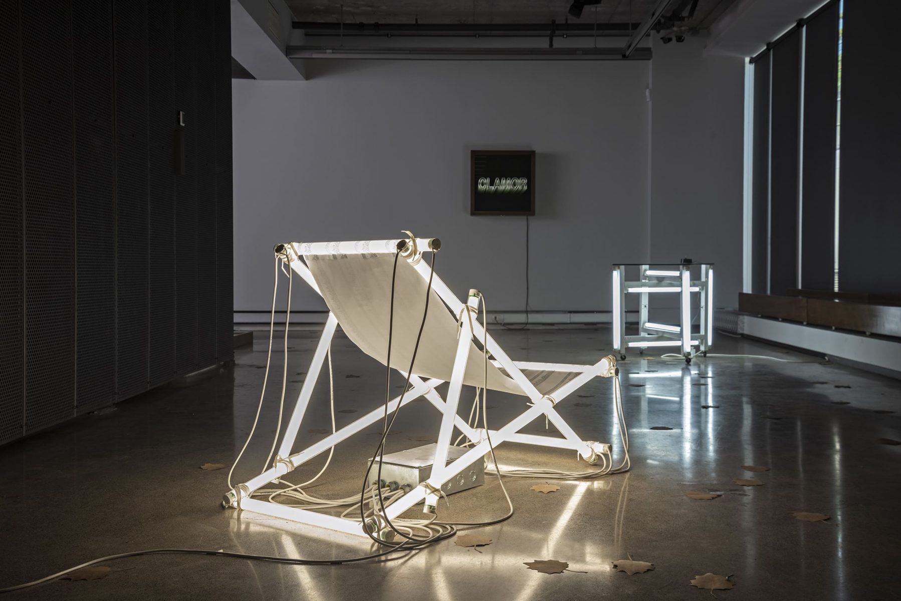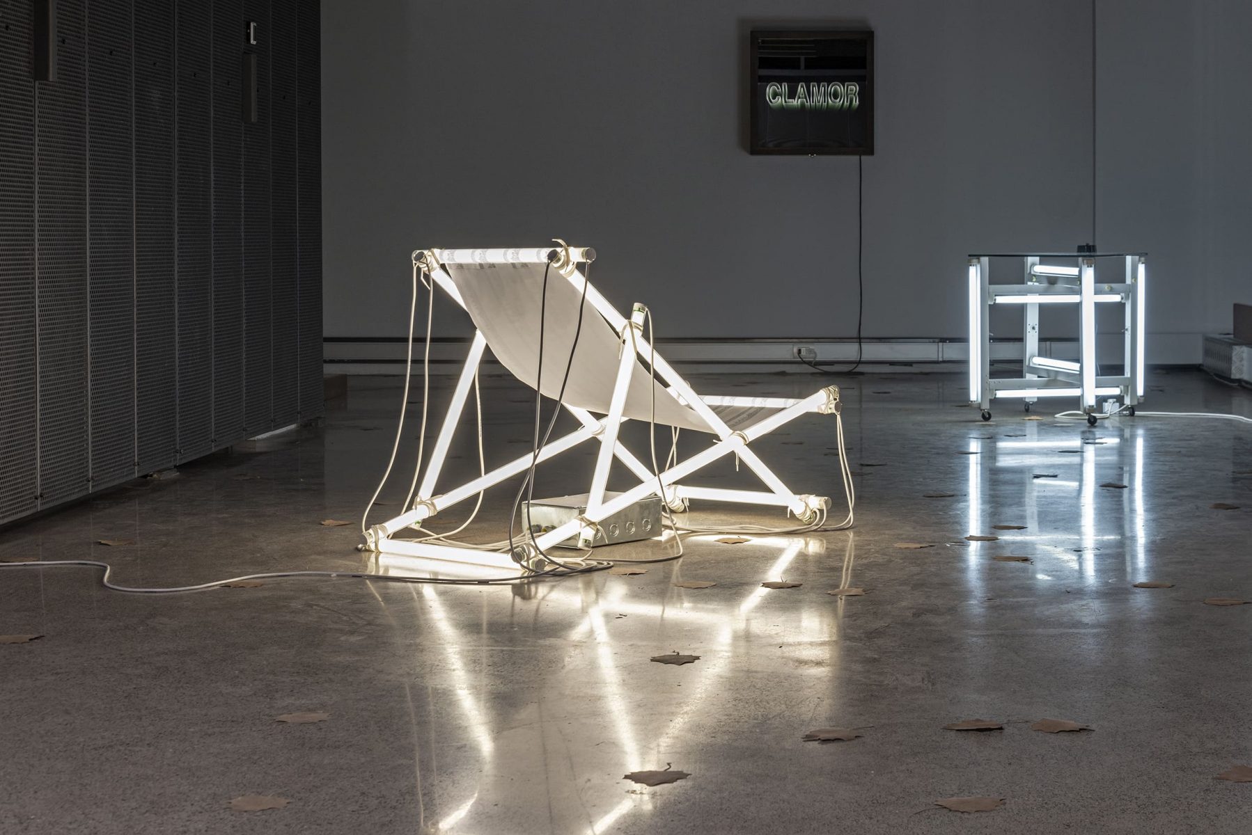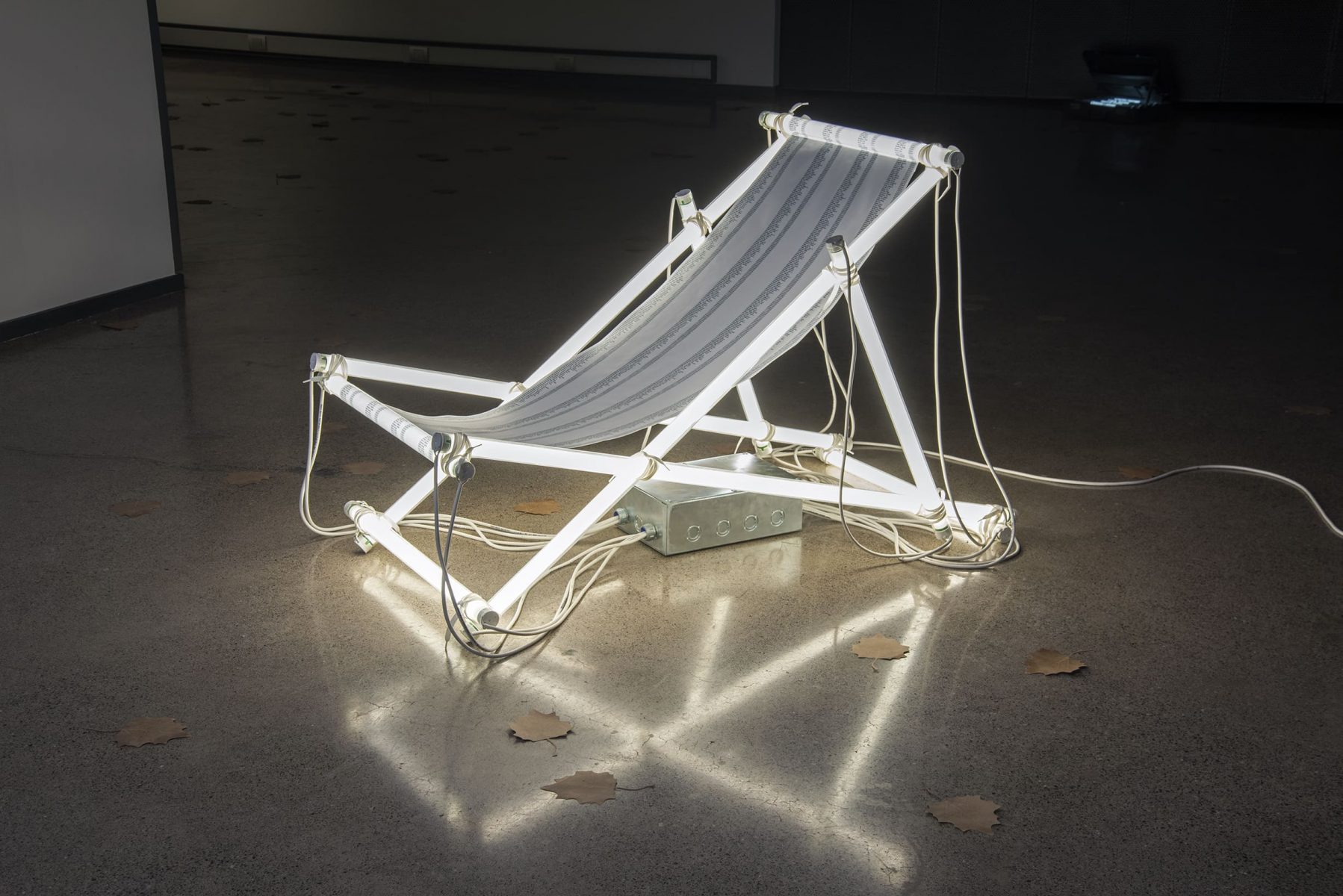 Para Iván Navarro la luz es una forma en el espacio, una nota que se hace tocar y una manera estratégica de capturar nuestra atención. Como polillas ensayando su muerte nos acercamos a un tubo flourescente prendido siempre –según un poeta– para que los borrachos se mantuvieran despiertos en un boliche, en una galería de arte, en una pieza oscura, ante un problema. Para que, sin poder ver, estando encandilados tuvieramos que escuchar… Please listening: el parpadeo del partidor, el zumbido del neón, la transmisión de corriente, la circulación de energía y el movimiento de un trompo metálico en un giro interminable. Y, detrás o más atrás de estos sonidos iniciales, retumban – más bajos pero más profundos– otros ruidos que son otras voces. Entre todas ellas, logramos distinguir emergiendo de estas obras: las preguntas formuladas frente a un espejo antes del interrogatorio; el clamor de un pueblo antes de ser callado; los gritos de un cuerpo sobre una silla eléctrica antes de la agonía final y las últimas palabras dichas en voz alta –sin saber que eran las últimas– antes de morir asesinado. En esta sucesión de sonidos, se escuchan también disparos, explosiones y bombardeos pero, más lejos aún, se escucha todavía la melodía de una canción que no ha dejado de sonar.