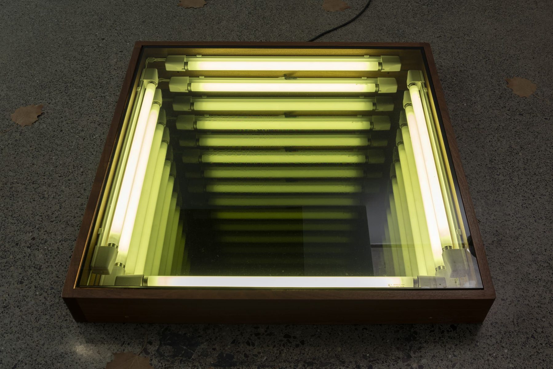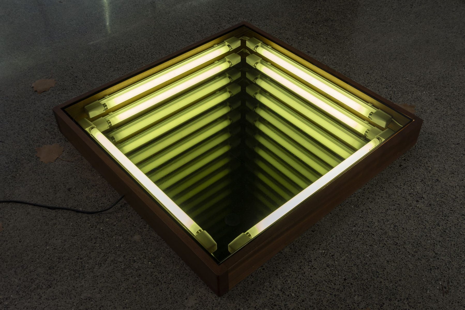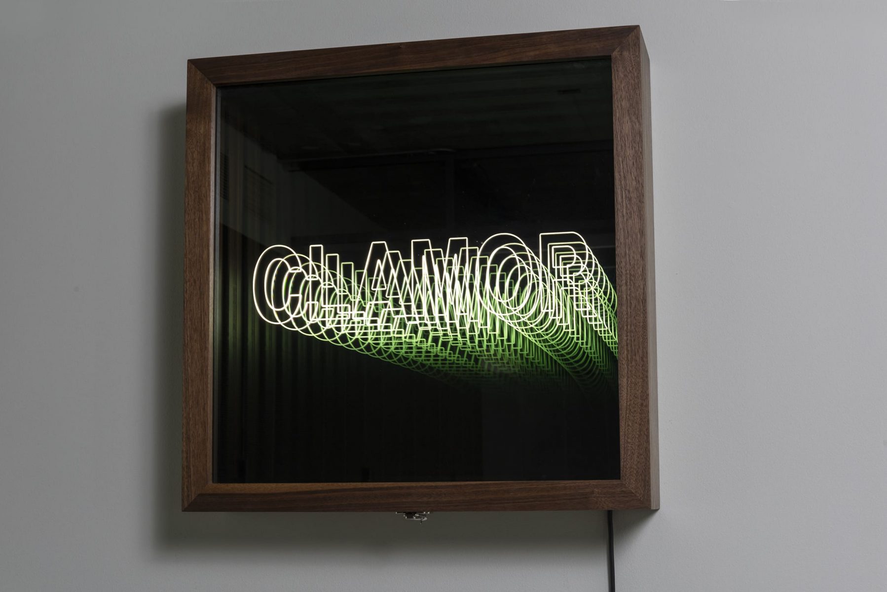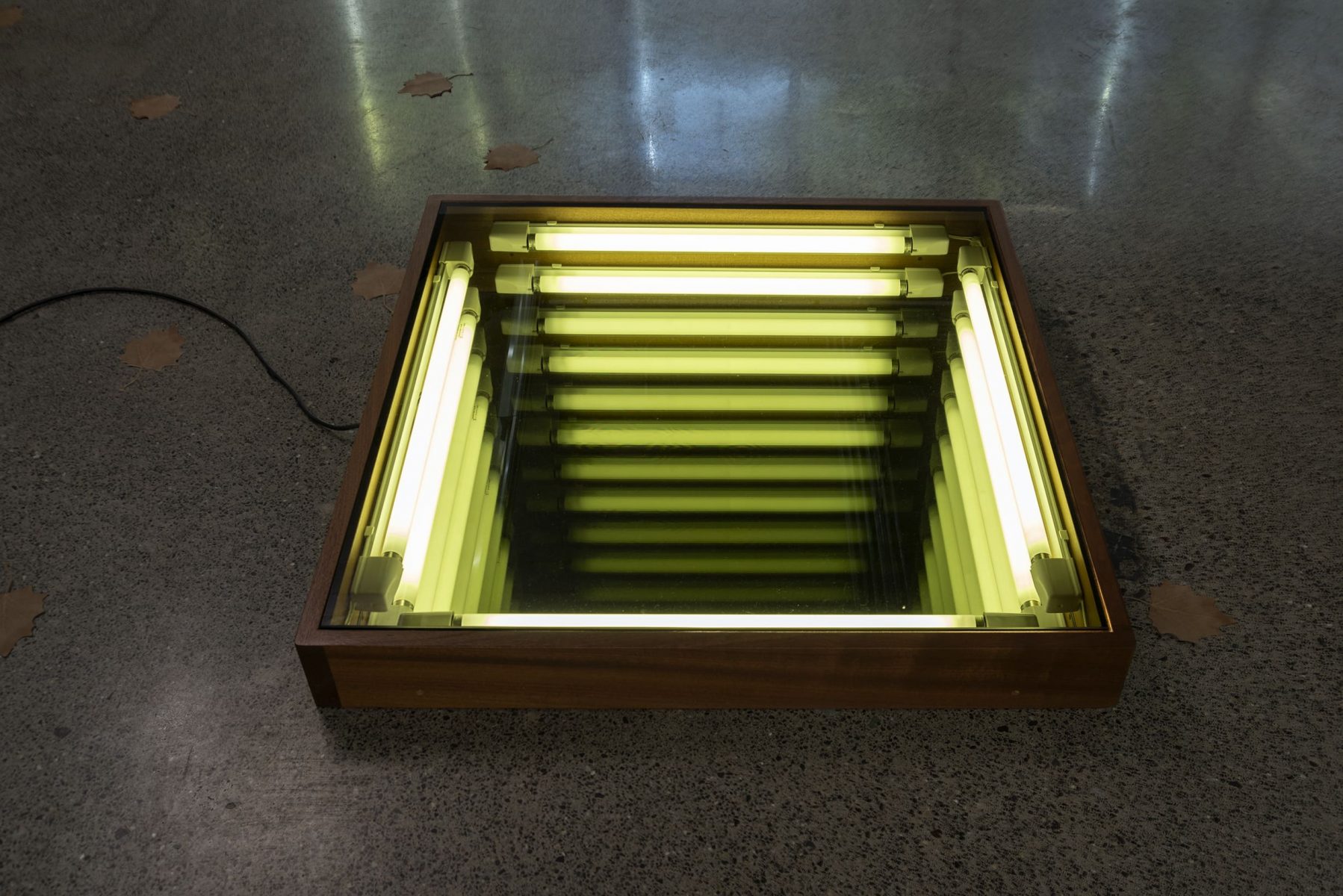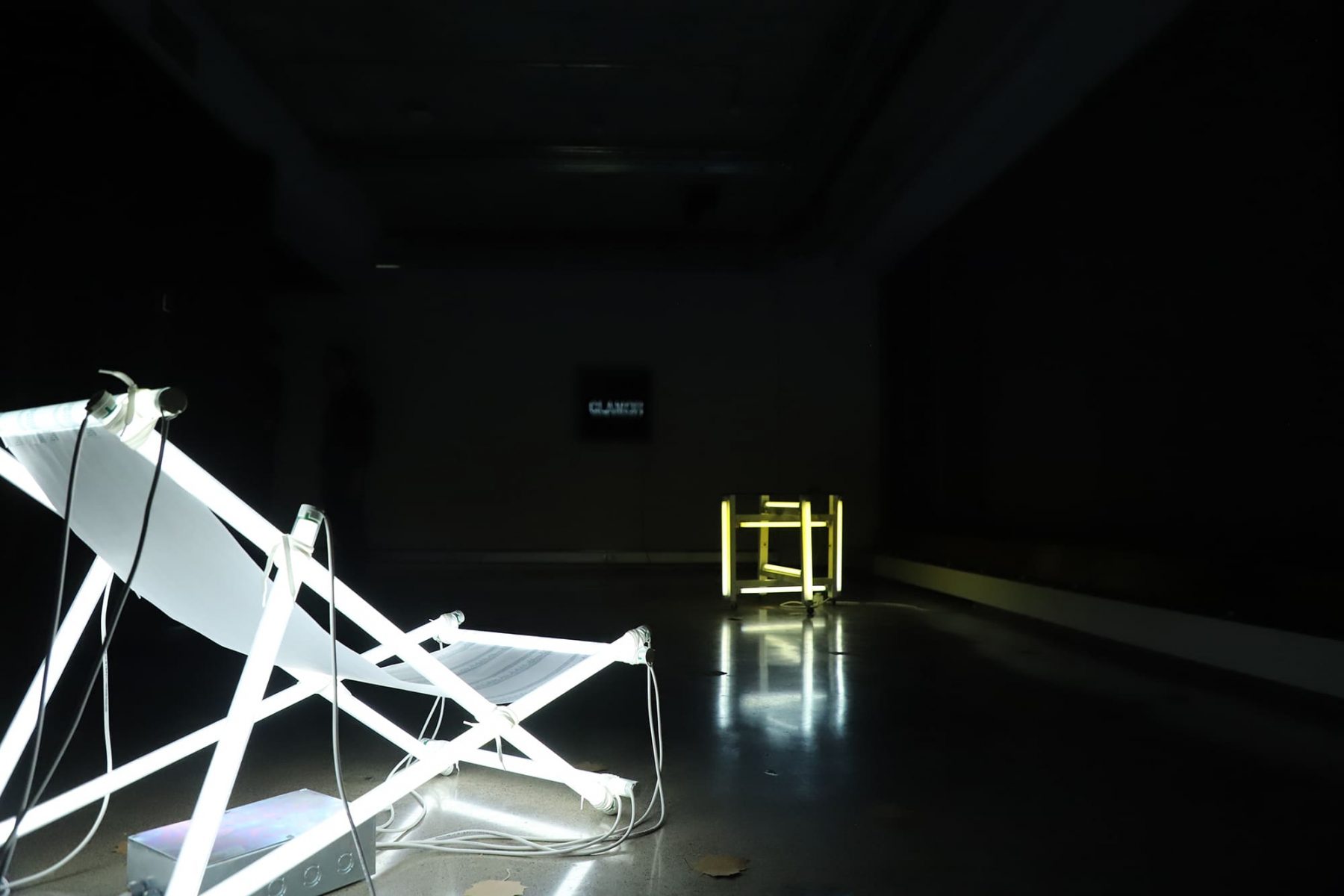 Un nocturno, por definición, es una composición musical sin forma específica que suele interpretarse de noche cuando la falta de luz agudiza los sentidos y enciende nuestros pensamientos. Un nocturno, visualmente, puede ser un incidente estético, una imagen sombría donde estallan luces. En esta ocasión, una habitación iluminada solo con objetos hechos de luz, suspendidos en la oscuridad, es un nocturno con puertas, sillas, mesas, espejos en los muros y un pozo, en el fondo, como un gran salto al vacío. Un famoso pintor escribió –luego de presenciar un bombardeo– que un nocturno es ante todo un arreglo de línea, forma y color. Un nocturno es ante todo un problema que intento resolver. Un problema –debemos agregar– entre luces y sombras: sombras chinescas, sombras eléctricas, sombras que inquietan, cuando the night became voice, the light became word. Las palabras reverberan y se hacen sombras con luces de neón, luces fluorescentes, luces que son líneas de color, pues quien trabaja con luz construye sombras.