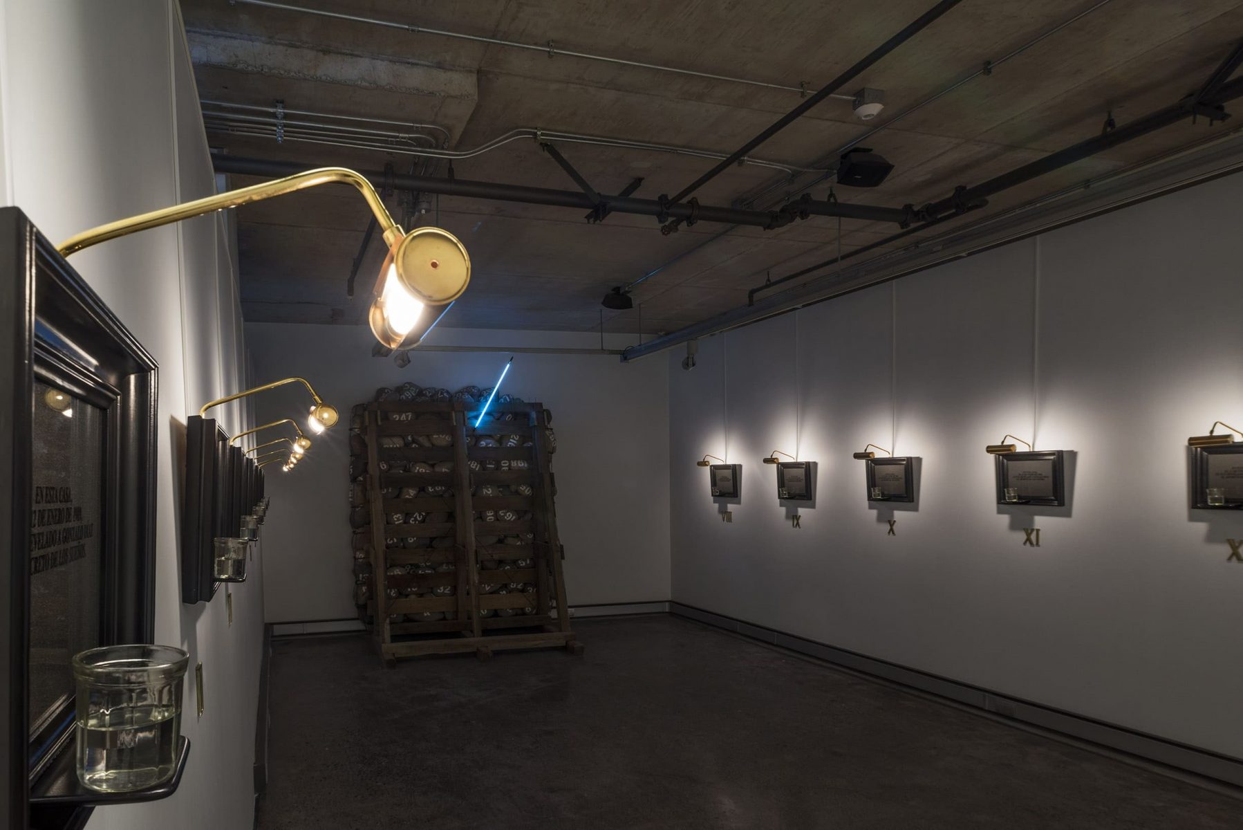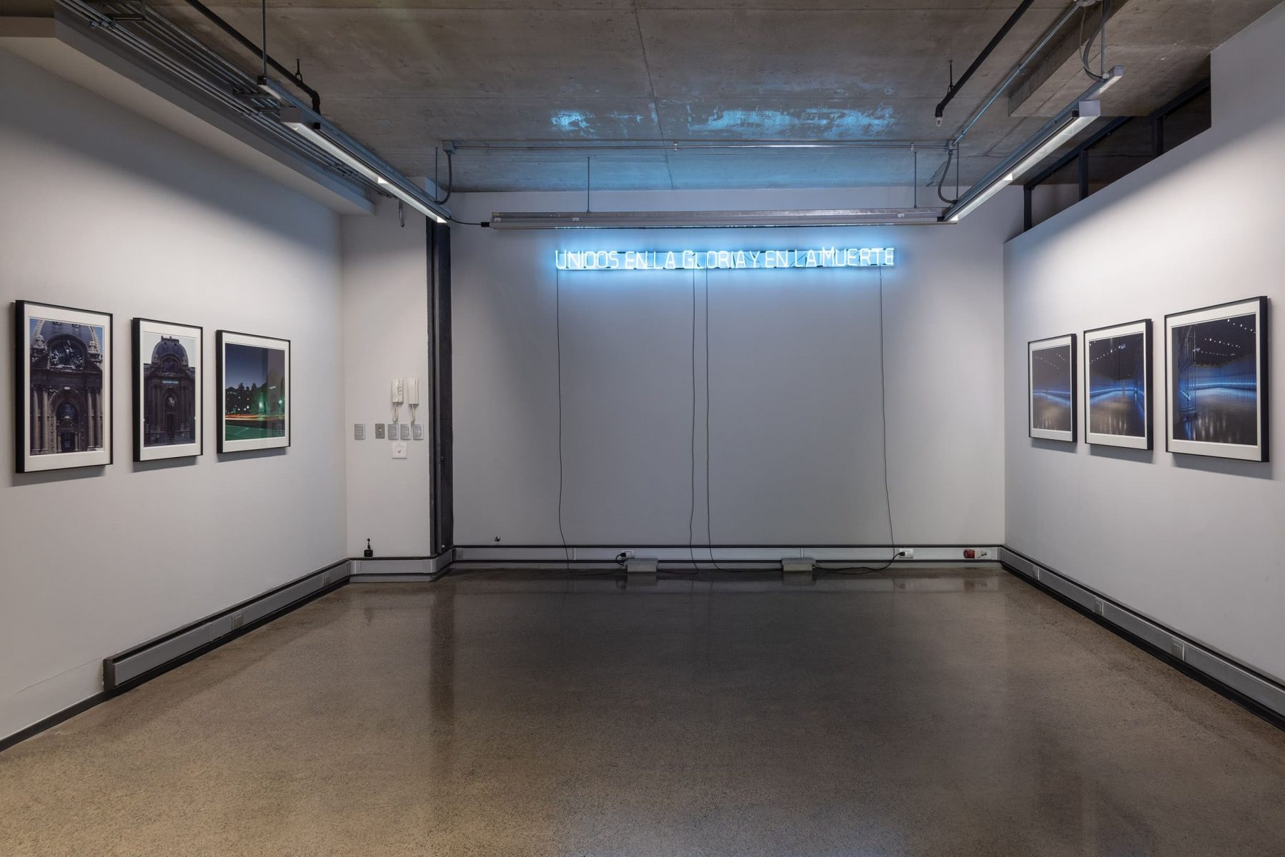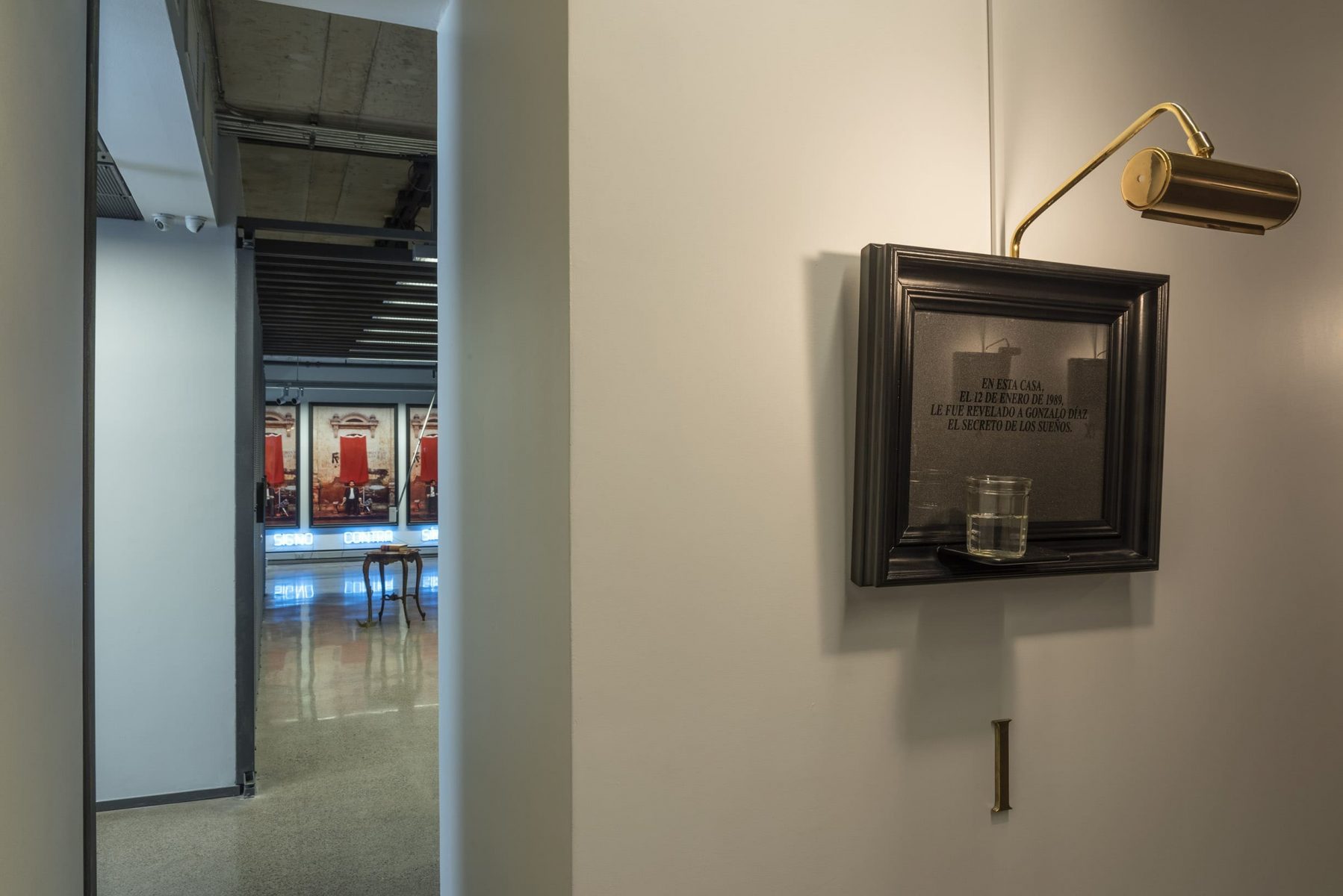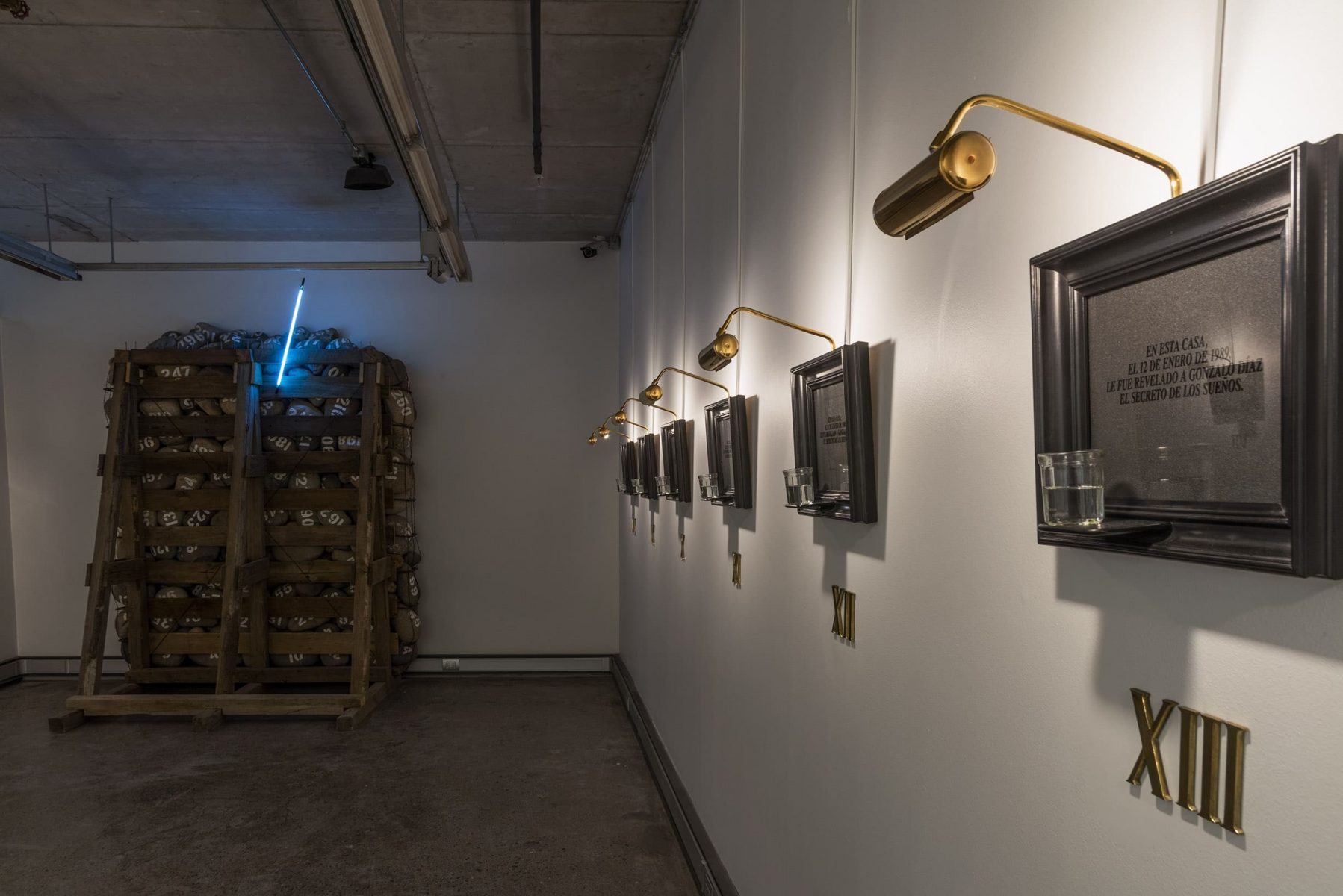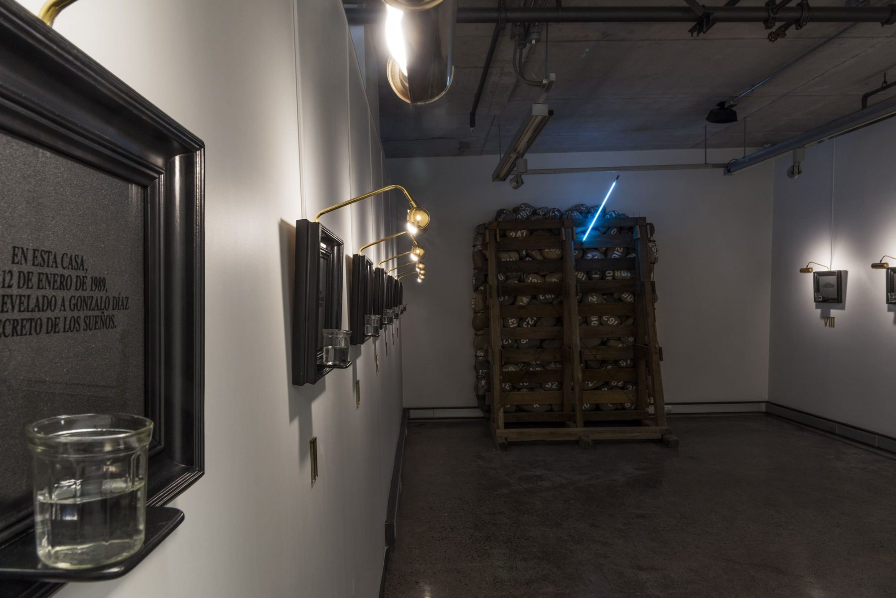 Las cinco obras que presentamos en esta muestra invitan a pensar en todo aquello que de nuestra historia sigue parpadeando, como las frágiles luces de neón que no han dejado de aparecer nunca en las obras de Gonzalo Díaz.