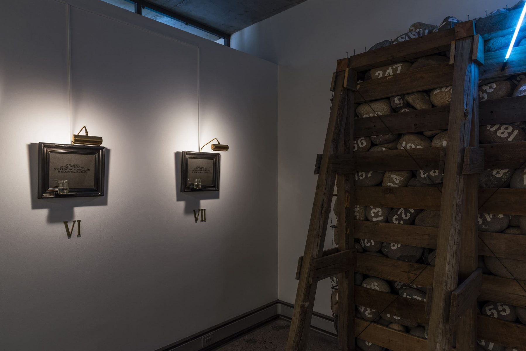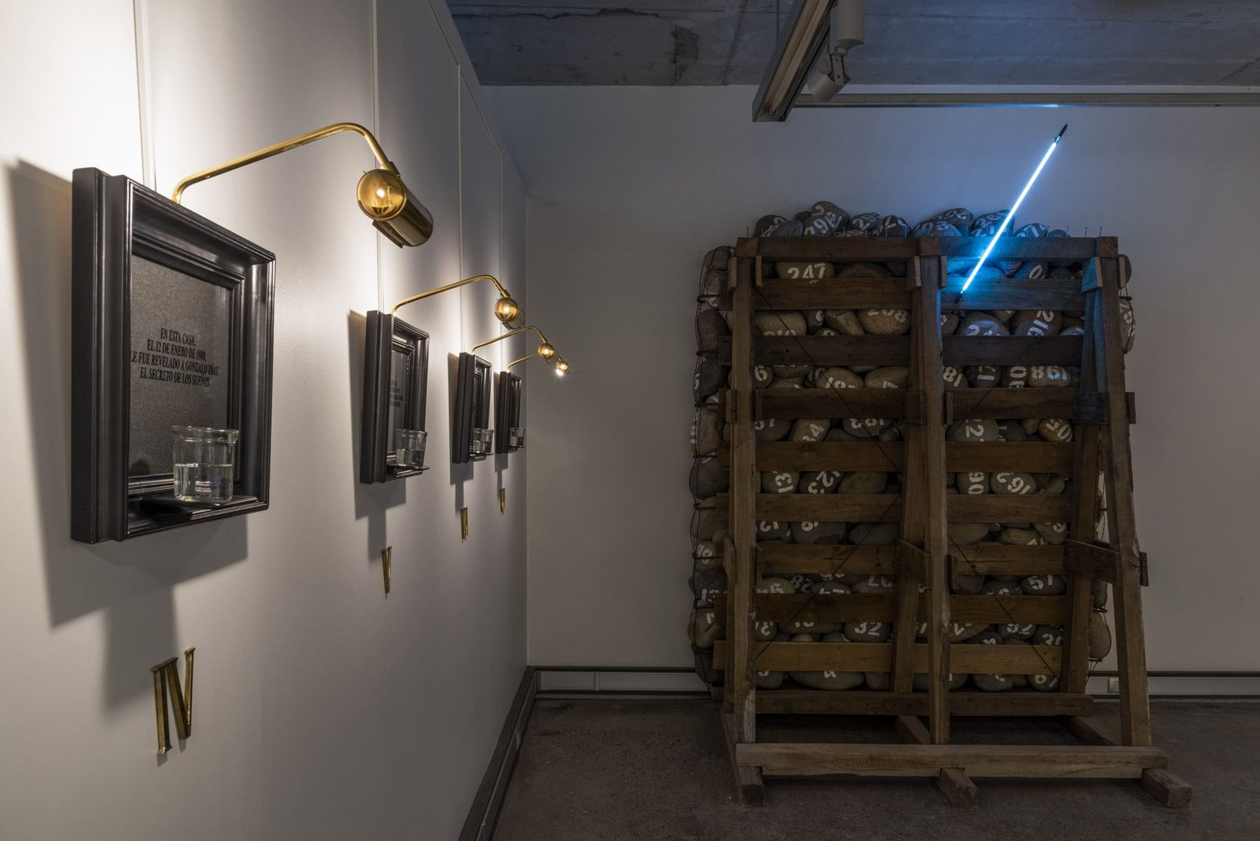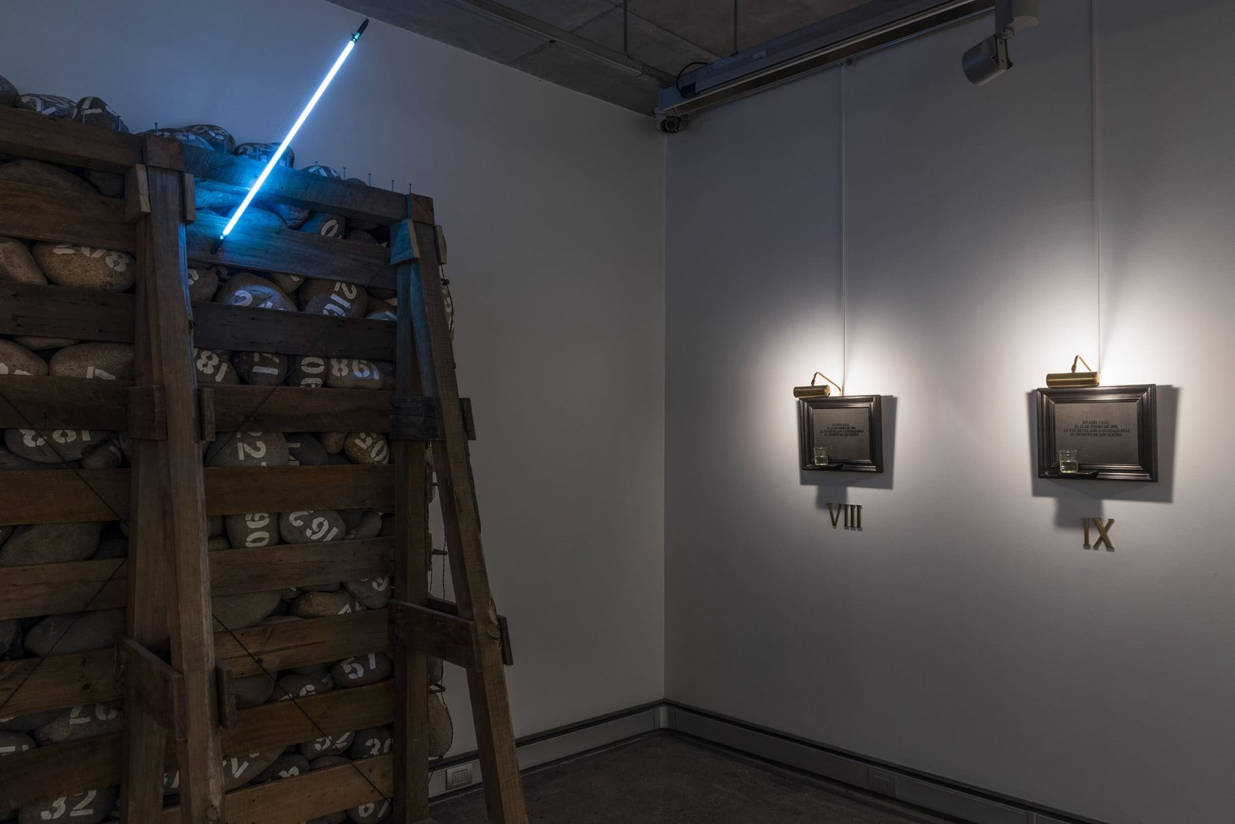 En las obras de Gonzalo Díaz, las preguntas fundamentales de nuestra historia reciente se plantean de cara a un dilema permanente: el de repensar visualmente la imagen de una república en ausencia y el drama de una vida colectiva fragmentada. Lonquén (1989), instalación permanente de Il Posto, insiste con agudeza en estas problemáticas. Expuesta por primera vez en la Galería Ojo de Buey el año 1989, esta obra fue un modo de procesar simbólicamente lo que el artista llamó el “punctum pestilente” de la Dictadura: el secuestro y asesinato de 15 campesinos de Lonquén y el hallazgo de sus restos en los hornos de una mina de cal convertidos ahora en una prueba indesmentible del horror.