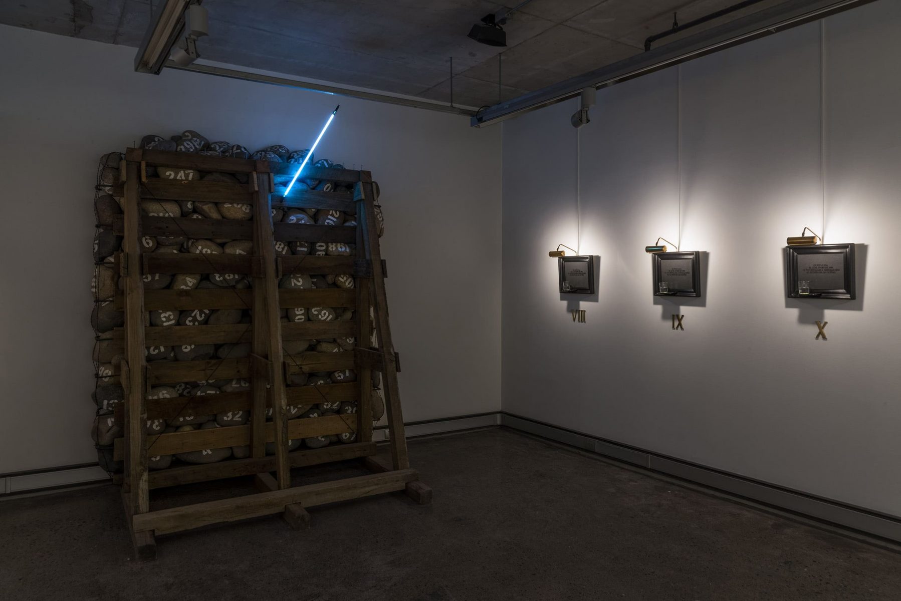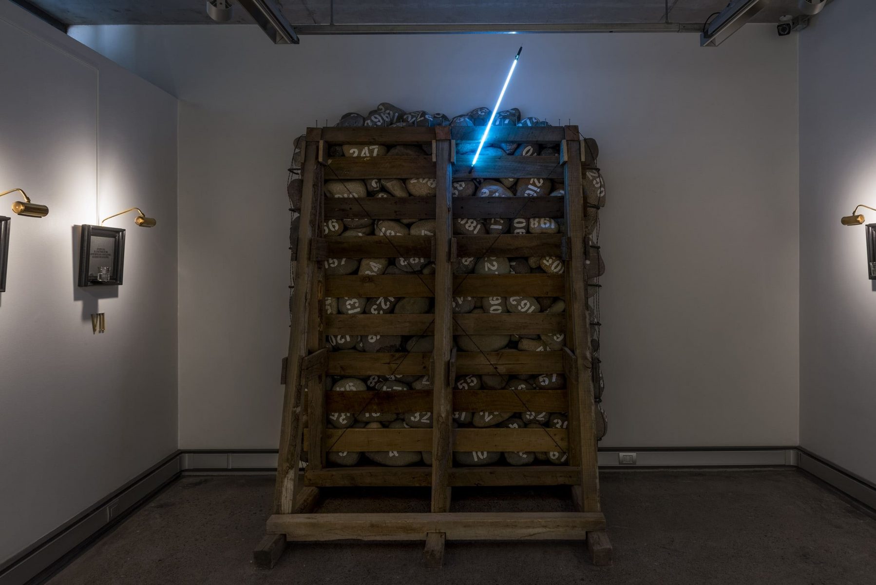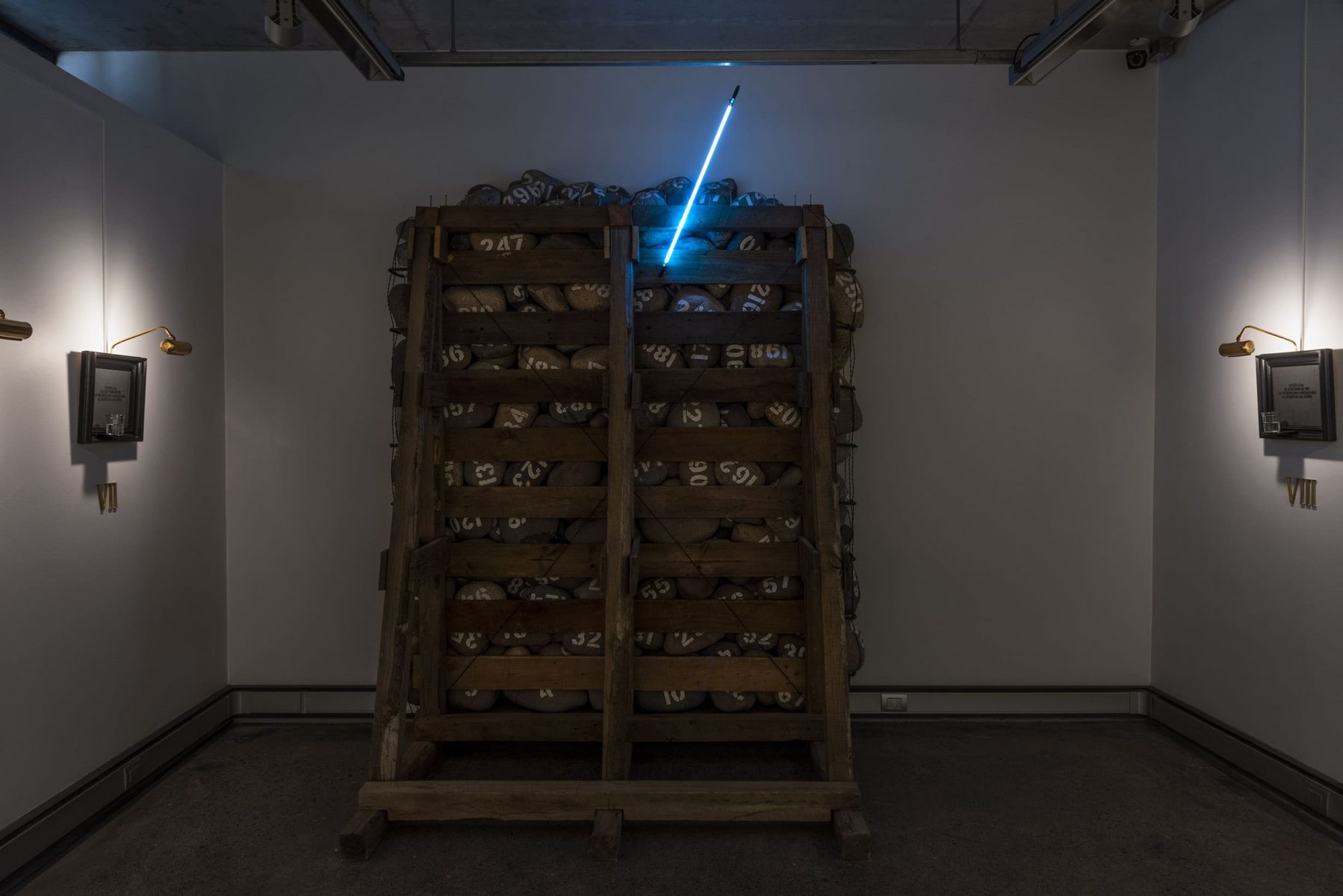 En las obras de Gonzalo Díaz, las preguntas fundamentales de nuestra historia reciente se plantean de cara a un dilema permanente: el de repensar visualmente la imagen de una república en ausencia y el drama de una vida colectiva fragmentada. Lonquén (1989), instalación permanente de Il Posto, insiste con agudeza en estas problemáticas. Expuesta por primera vez en la Galería Ojo de Buey el año 1989, esta obra fue un modo de procesar simbólicamente lo que el artista llamó el “punctum pestilente” de la Dictadura: el secuestro y asesinato de 15 campesinos de Lonquén y el hallazgo de sus restos en los hornos de una mina de cal convertidos ahora en una prueba indesmentible del horror.