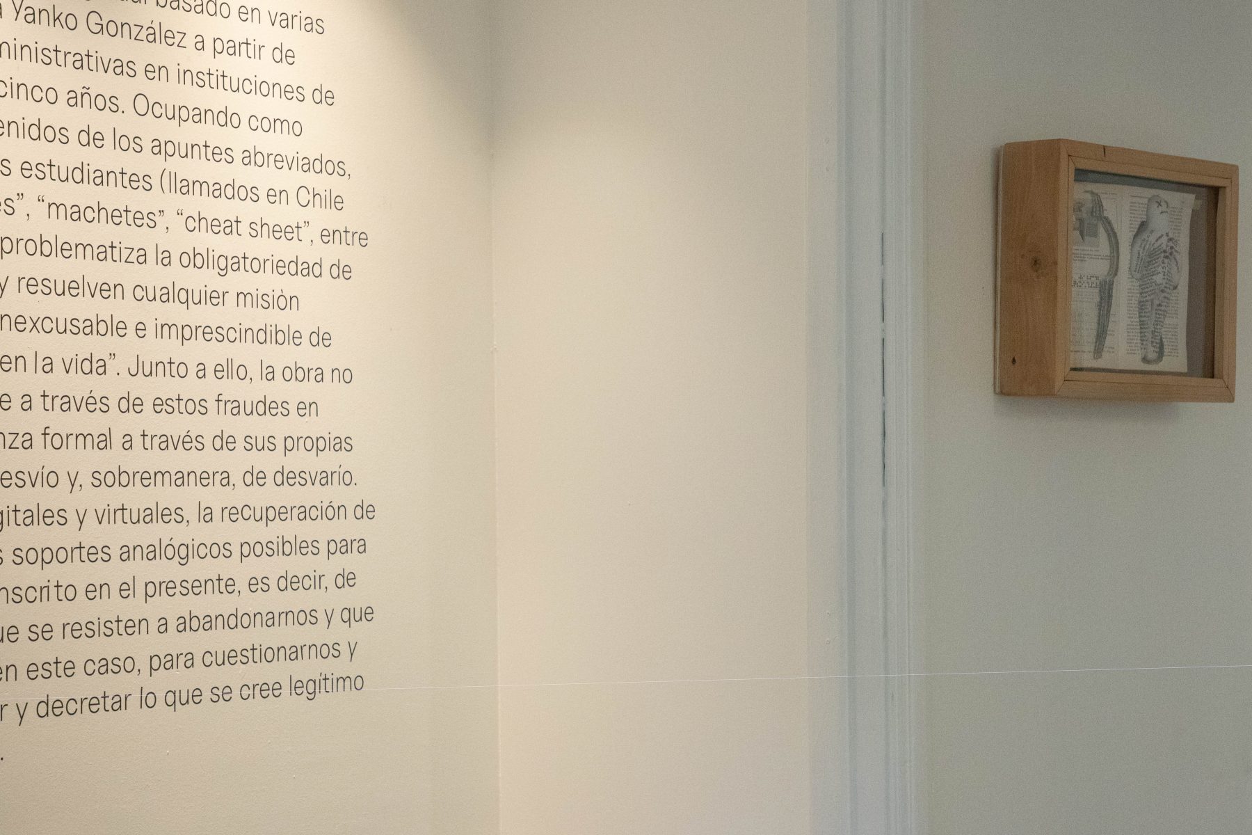 Ocupando como metáfora el continente y el tipo de contenidos de los apuntes abreviados, miniaturizados y escondidos por las y los estudiantes (llamados en Chile “torpedos” y en otros países “acordeones”, “machetes”, “cheat sheet”, entre otras muchas denominaciones), el libro y la exhibición Torpedos problematizan la obligatoriedad de adquirir las claves culturales que abren y resuelven cualquier misión biográfica a través de lo que se estima inexcusable e imprescindible de aprender y memorizar para ser “alguien en la vida”. Junto a ello, González no sólo aborda la simulación del aprendizaje a través de estos fraudes en miniatura, sino también, la de la enseñanza formal a través de sus propias inconsistencias retóricas, fórmulas de desvío y, sobremanera, de desvarío. Pero hay algo más. En estos tiempos digitales y virtuales, la recuperación de materialidades textuales y de inusitados soportes analógicos posibles para resguardarlas, nos habla de un pasado inscrito en el presente, es decir, de persistencias y prácticas escriturales que se resisten a abandonarnos y que de tanto en tanto pueden volver, como en este caso, para cuestionarnos y erosionar nuestras fórmulas de moldurar y decretar lo que se cree legítimo transmitir en nuestra sociedad y cultura.