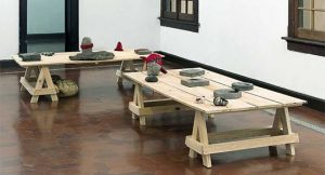La Bienal de Arte Paiz es organizada por la Fundación Paiz desde 1978 y para 2025-2026 prepara su versión número 24. Antonio Pichillá participó en ella el 2002 (cuando aún era estudiante de arte), el 2010 y luego en la versión número 19 realizada el 2014, donde apareció como uno de los 31 artistas guatemaltecos seleccionados bajo el concepto “Trans-visible” (entre un ya no y aún no), junto con otros exponentes del ya denominado arte contemporáneo maya (Marilyn Boror, Edgar Calel, Benvenuto Chavajay, Manuel Cavajay, Fernando Poyón). Dentro del equipo curatorial de esta última muestra estaba Cecilia Fajardo-Hill, historiadora del arte y curadora venezolano-británica especializada en arte contemporáneo latinoamericano, quien recuerda especialmente cuando conoce la obra de Pichillá: “era una instalación realmente increíble de piedras amarradas que realizó el artista para esa Bienal”9Cecilia Fajardo-Hill, entrevista realizada el 8 de enero de 2025. La instalación a la que se refiere Fajardo-Hill se llama “Glifos (arqueología contemporánea)”. En ella, “Pichillá construye dos mesas de madera como altares para presentar piedras ceremoniales que ha trasladado desde su comunidad hasta la sala de exposiciones. Algunas de las piedras están labradas, otras están cubiertas con hilos o retazos de telas y muestran restos de hollín o parafina de vela”10José Luis Bolndet, “19 Bienal de Arte Paiz”,en ArtNexus 95, 2015, s/p. Disponible en: https://www.artnexus.com/es/magazines/article-magazine-artnexus/5d641d3790cc21cf7c0a418c/95/19-bienal-de-arte-paiz.