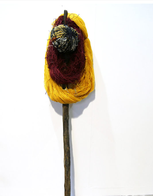 De las tres obras de Pichillá donadas al MNCARS, dos -”Abuelo” y “Quipu”- se pusieron en exhibición junto a otras obras de artistas maya como Marilyn Boror, Edgar Calel, Benvenuto Chavajay y los hermanos Ángel y Fernando Poyón. “Quipu” se retiró posteriormente30Según el registro de movimiento de obra del Museo, “Quipu” entró a bodega en marzo de 2023 como parte de una rotación de fondos; en cambio, la obra “Abuelo” permanece en la sala 002.17 del Edificio Sabatini. Si bien para algunos críticos, como Alexia Tala, el montaje de estas obras no hizo sino profundizar la brecha colonial al dejar a todos los artistas maya juntos en una misma sala, sin posibilidad de dialogar con otras obras y con otros discursos -como sucedió por ejemplo en el caso la propuesta del Tate en Inglaterra31Alexia Tala, entrevista realizada el 17 de diciembre de 2024-, para el propio Pichillá, la decisión de cómo se exponen sus obras en el museo corresponde más bien a la institución. Además, el artista asume sin mayor conflicto que su incidencia en esta muestra no es la misma que puede tener en sus exposiciones individuales, donde dispone las obras en el espacio según sus propios criterios artísticos. En este punto es preciso advertir que las obras de Pichillá no solo han fortalecido determinadas expresiones plásticas que forman parte de su filosofía de vida, de trabajo y de comprensión del mundo, sino que también buscan una presencia en el espacio que les permita dialogar. Hay en este sentido una conciencia del artista en torno al espacio y el montaje que configuran el discurso de una muestra. Por eso en sus exposiciones las obras no se ubican en forma lineal. Como dice el artista: