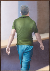 Las pinturas que Yrarrázaval produce en esta época —la década de los ochenta— se presentan en Il Posto como un palimpsesto de correspondencias y miradas: rostros con diferentes grados de literalidad, borrado y densidad matérica. En su ensayo “Estética del silencio”, Pedro Celedón se detiene en Estrategias y pronósticos (1983) , una de las obras incluidas en esta muestra, para señalar que “la respuesta pictórica genera rostros medio borrados, como si una neblina se antepusiera a su humanidad”, y que “llega a ser doloroso el contraste entre la humanidad de ese rostro desdibujado y su corbata metálica, absolutamente definida, inmaculada”9Pedro Celedón, “La estética del silencio”, en Retrospectiva 50 años. Ricardo Yrarrázaval, Sala de Arte Fundación Telefónica, Santiago, 2002, p. 16. Al final de la sala, una sola pintura solitaria clausura el recorrido: Sin vuelta atrás (1980). La espalda de un hombre que se aleja de nosotros resume, en un gesto mínimo, el peso de toda una época. La década se cierra con su propio comienzo: la imposibilidad de regresar. Yrarrázaval lo dice en palabras que resuenan con sus imágenes: “Cuando voy al centro estoy muy consciente del ambiente que se da en ese banco, en esa oficina pública. Me intrigan esos hombres, personajes fríos, anónimos. No puedo dejar de pensar en sus vidas, en sus anhelos, ambiciones”10Ricardo Yrarrázaval, conversación con Renato Yrarrázaval publicada en Cinco expresiones de la figuración en Chile. Dávila, Lira, Yrarrázaval, Bru, Smythe, Galería Cromo, Santiago, 1977 (s/p).